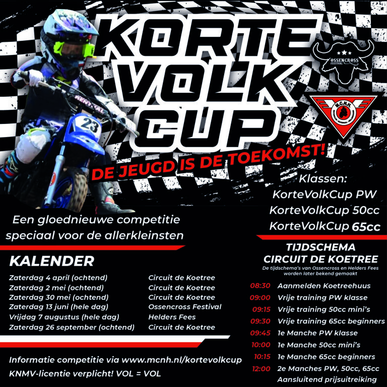 De KorteVolkCup wordt verreden tijdens verschillende evenementen: de clubcrossen op Circuit de Koetree, de Ossencross en het motorspektakel tijdens het Helders Fees. Meer informatie is te vinden op de flyer hieronder.